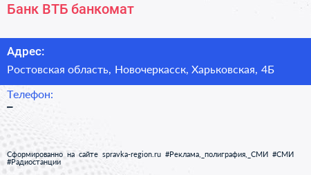 Банк ВТБ, банкомат по адресу Ростовская область, Новочеркасск, Харьковская, 4Б в дальнейшем Организация, размещена в следующих категориях: