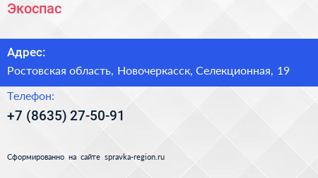 Экоспас по адресу Ростовская область, Новочеркасск, Селекционная, 19 в дальнейшем Организация, размещена в следующих категориях: