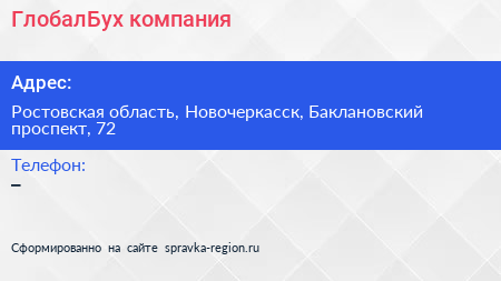 ГлобалБух, компания по адресу Ростовская область, Новочеркасск, Баклановский проспект, 72 в дальнейшем Организация, размещена в следующих категориях: