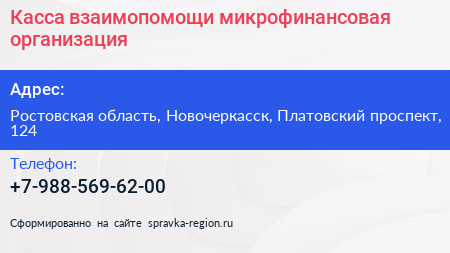 Касса взаимопомощи, микрофинансовая организация по адресу Ростовская область, Новочеркасск, Платовский проспект, 124 в дальнейшем Организация, размещена в следующих категориях: