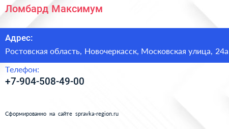 Ломбард Максимум по адресу Ростовская область, Новочеркасск, Московская улица, 24а в дальнейшем Организация, размещена в следующих категориях: