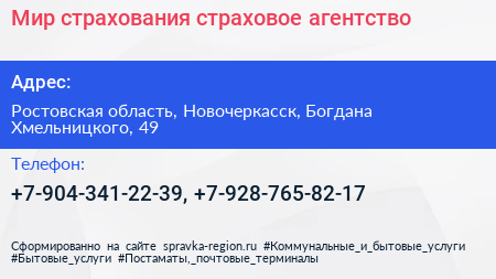 Мир страхования, страховое агентство по адресу Ростовская область, Новочеркасск, Богдана Хмельницкого, 49 в дальнейшем Организация, размещена в следующих категориях: