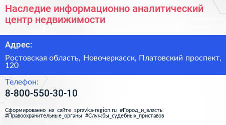 Наследие, информационно-аналитический центр недвижимости по адресу Ростовская область, Новочеркасск, Платовский проспект, 120 в дальнейшем Организация, размещена в следующих категориях: