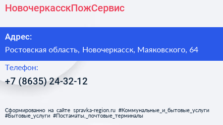 НовочеркасскПожСервис по адресу Ростовская область, Новочеркасск, Маяковского, 64 в дальнейшем Организация, размещена в следующих категориях: