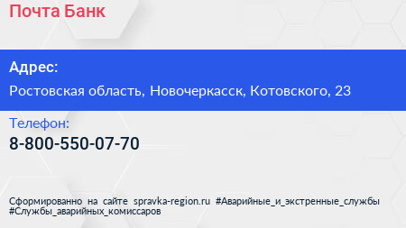Почта Банк по адресу Ростовская область, Новочеркасск, Котовского, 23 в дальнейшем Организация, размещена в следующих категориях: