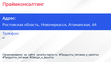 Праймконсалтинг по адресу Ростовская область, Новочеркасск, Атаманская, 64 в дальнейшем Организация, размещена в следующих категориях: