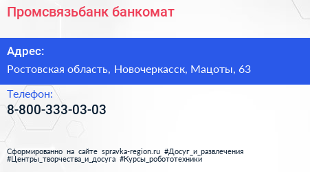Промсвязьбанк, банкомат по адресу Ростовская область, Новочеркасск, Мацоты, 63 в дальнейшем Организация, размещена в следующих категориях:
