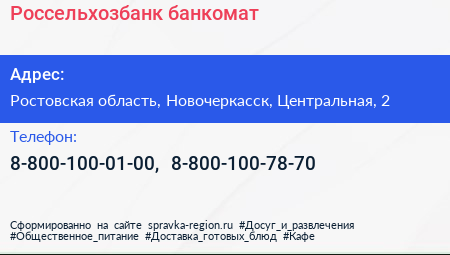 Россельхозбанк, банкомат по адресу Ростовская область, Новочеркасск, Центральная, 2 в дальнейшем Организация, размещена в следующих категориях:
