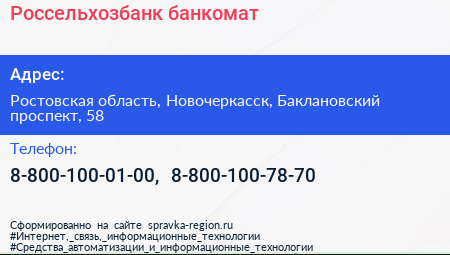 Россельхозбанк, банкомат по адресу Ростовская область, Новочеркасск, Баклановский проспект, 58 в дальнейшем Организация, размещена в следующих категориях: