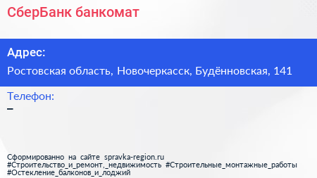 СберБанк, банкомат по адресу Ростовская область, Новочеркасск, Будённовская, 141 в дальнейшем Организация, размещена в следующих категориях: