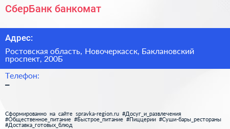 СберБанк, банкомат по адресу Ростовская область, Новочеркасск, Баклановский проспект, 200Б в дальнейшем Организация, размещена в следующих категориях: