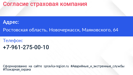 Согласие, страховая компания по адресу Ростовская область, Новочеркасск, Маяковского, 64 в дальнейшем Организация, размещена в следующих категориях: