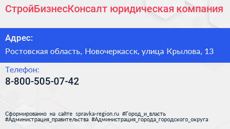 СтройБизнесКонсалт, юридическая компания по адресу Ростовская область, Новочеркасск, улица Крылова, 13 в дальнейшем Организация, размещена в следующих категориях: