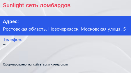 Sunlight, сеть ломбардов по адресу Ростовская область, Новочеркасск, Московская улица, 5 в дальнейшем Организация, размещена в следующих категориях: