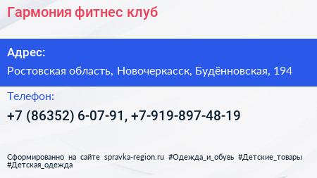 Гармония, фитнес-клуб по адресу Ростовская область, Новочеркасск, Будённовская, 194 в дальнейшем Организация, размещена в следующих категориях:
