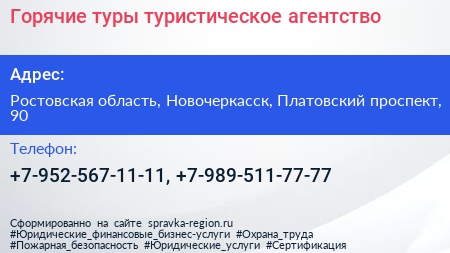 Горячие туры, туристическое агентство по адресу Ростовская область, Новочеркасск, Платовский проспект, 90 в дальнейшем Организация, размещена в следующих категориях: