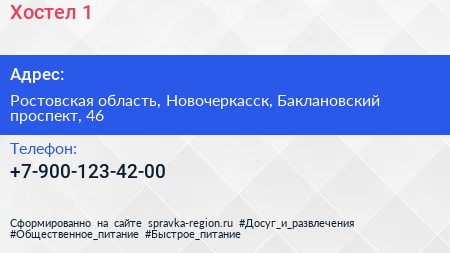 Хостел#1 по адресу Ростовская область, Новочеркасск, Баклановский проспект, 46 в дальнейшем Организация, размещена в следующих категориях: