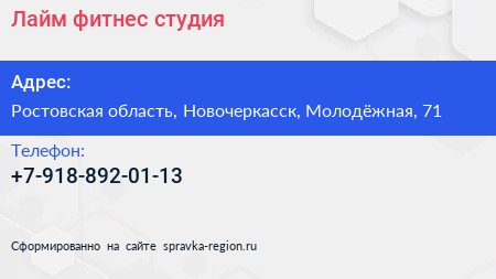 Лайм, фитнес-студия по адресу Ростовская область, Новочеркасск, Молодёжная, 71 в дальнейшем Организация, размещена в следующих категориях: