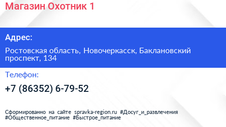 Магазин Охотник №1 по адресу Ростовская область, Новочеркасск, Баклановский проспект, 134 в дальнейшем Организация, размещена в следующих категориях: