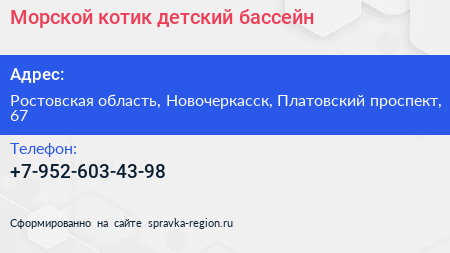 Морской котик, детский бассейн по адресу Ростовская область, Новочеркасск, Платовский проспект, 67 в дальнейшем Организация, размещена в следующих категориях: