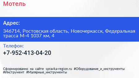 Мотель по адресу 346714, Ростовская область, Новочеркасск, Федеральная трасса М-4 1037 км, 4 в дальнейшем Организация, размещена в следующих категориях: