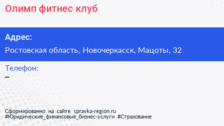 Олимп, фитнес-клуб по адресу Ростовская область, Новочеркасск, Мацоты, 32 в дальнейшем Организация, размещена в следующих категориях: