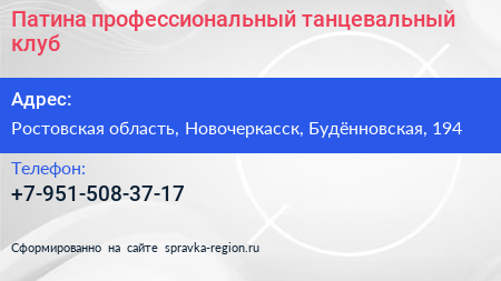 Патина, профессиональный танцевальный клуб по адресу Ростовская область, Новочеркасск, Будённовская, 194 в дальнейшем Организация, размещена в следующих категориях: