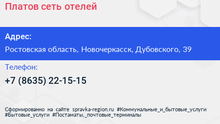 Платов, сеть отелей по адресу Ростовская область, Новочеркасск, Дубовского, 39 в дальнейшем Организация, размещена в следующих категориях: