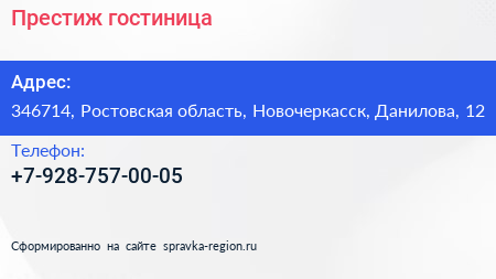 Престиж, гостиница по адресу 346714, Ростовская область, Новочеркасск, Данилова, 12 в дальнейшем Организация, размещена в следующих категориях: