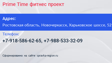 Prime Time, фитнес-проект по адресу Ростовская область, Новочеркасск, Харьковское шоссе, 52 в дальнейшем Организация, размещена в следующих категориях: