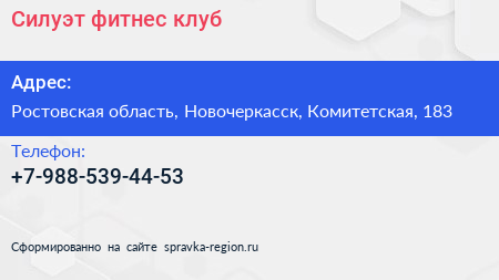 Силуэт, фитнес-клуб по адресу Ростовская область, Новочеркасск, Комитетская, 183 в дальнейшем Организация, размещена в следующих категориях: