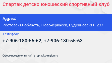 Спартак, детско-юношеский спортивный клуб по адресу Ростовская область, Новочеркасск, Будённовская, 237 в дальнейшем Организация, размещена в следующих категориях: