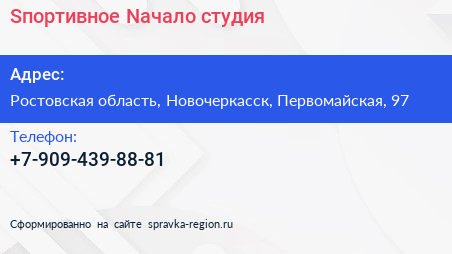 Sпортивное Nачало, студия по адресу Ростовская область, Новочеркасск, Первомайская, 97 в дальнейшем Организация, размещена в следующих категориях: