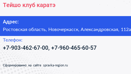 Тейшо, клуб каратэ по адресу Ростовская область, Новочеркасск, Александровская, 112а в дальнейшем Организация, размещена в следующих категориях: