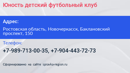 Юность, детский футбольный клуб по адресу Ростовская область, Новочеркасск, Баклановский проспект, 150 в дальнейшем Организация, размещена в следующих категориях: