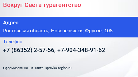 Вокруг Света, турагентство по адресу Ростовская область, Новочеркасск, Фрунзе, 108 в дальнейшем Организация, размещена в следующих категориях:
