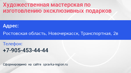 Художественная мастерская по изготовлению эксклюзивных подарков по адресу Ростовская область, Новочеркасск, Транспортная, 2в в дальнейшем Организация, размещена в следующих категориях: