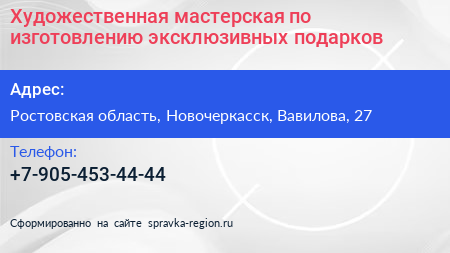 Художественная мастерская по изготовлению эксклюзивных подарков по адресу Ростовская область, Новочеркасск, Вавилова, 27 в дальнейшем Организация, размещена в следующих категориях: