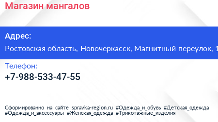 Магазин мангалов по адресу Ростовская область, Новочеркасск, Магнитный переулок, 1 в дальнейшем Организация, размещена в следующих категориях: