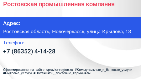 Ростовская промышленная компания по адресу Ростовская область, Новочеркасск, улица Крылова, 13 в дальнейшем Организация, размещена в следующих категориях: