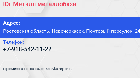 Юг-Металл, металлобаза по адресу Ростовская область, Новочеркасск, Почтовый переулок, 24 в дальнейшем Организация, размещена в следующих категориях: