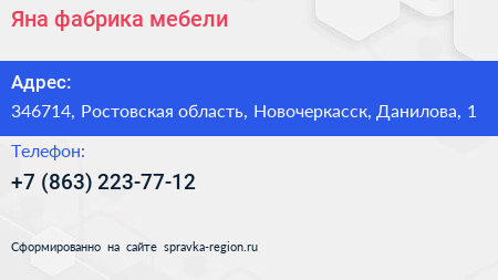 Яна, фабрика мебели по адресу 346714, Ростовская область, Новочеркасск, Данилова, 1 в дальнейшем Организация, размещена в следующих категориях: