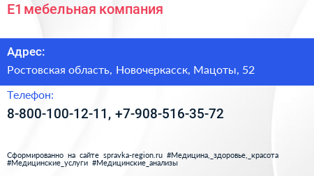 Е1, мебельная компания по адресу Ростовская область, Новочеркасск, Мацоты, 52 в дальнейшем Организация, размещена в следующих категориях: