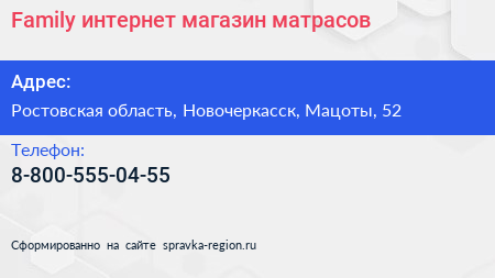 Family, интернет-магазин матрасов по адресу Ростовская область, Новочеркасск, Мацоты, 52 в дальнейшем Организация, размещена в следующих категориях: