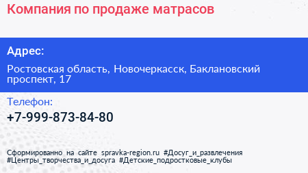 Компания по продаже матрасов по адресу Ростовская область, Новочеркасск, Баклановский проспект, 17 в дальнейшем Организация, размещена в следующих категориях: