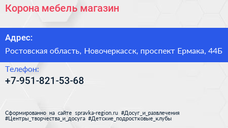 Корона мебель, магазин по адресу Ростовская область, Новочеркасск, проспект Ермака, 44Б в дальнейшем Организация, размещена в следующих категориях:
