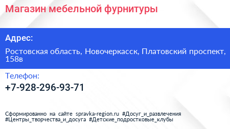 Магазин мебельной фурнитуры по адресу Ростовская область, Новочеркасск, Платовский проспект, 158в в дальнейшем Организация, размещена в следующих категориях: