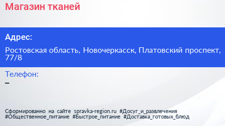 Магазин тканей по адресу Ростовская область, Новочеркасск, Платовский проспект, 77/8 в дальнейшем Организация, размещена в следующих категориях: