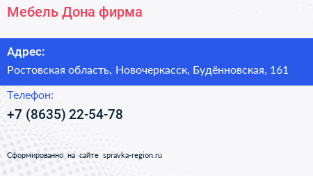 Мебель Дона, фирма по адресу Ростовская область, Новочеркасск, Будённовская, 161 в дальнейшем Организация, размещена в следующих категориях: