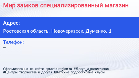 Мир замков, специализированный магазин по адресу Ростовская область, Новочеркасск, Думенко, 1 в дальнейшем Организация, размещена в следующих категориях: